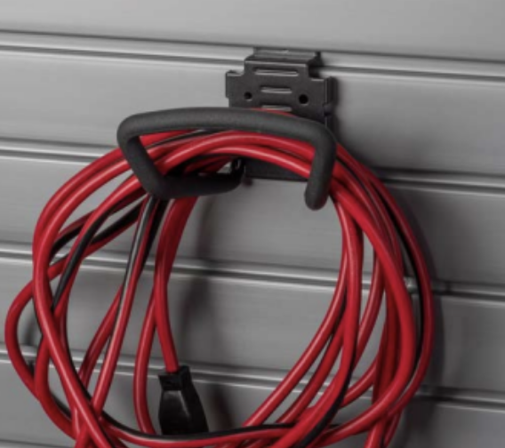 Different hook options to store garden hoses, extension cords, etc.